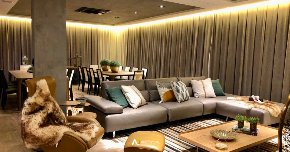 Para a parte interna deste lar, utilizamos materiais e cores vindos de inspirações da natureza. O uso da madeira, das tijoletas feitas com pedras naturais e dos tecidos de couro, linho e palha, remetem ao natural e a utilização do verde e marrons nos tecidos e objetos de decoração também trazem a ideia de integração com o natural, que é muito presente nas áreas externas da residência.