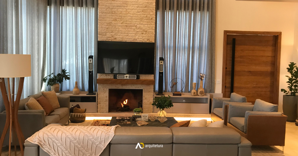 Para a parte interna dessa residência foi pensado em trazer um toque contemporâneo para combinar com o estilo externo, mas ao mesmo tempo, as escolhas de materiais de revestimentos e acabamentos buscaram ser mais aconchegantes e confortáveis, remetendo a ideia de casa de campo, como o uso da pedra natural da lareira e as madeiras que aparecem também no mobiliário.