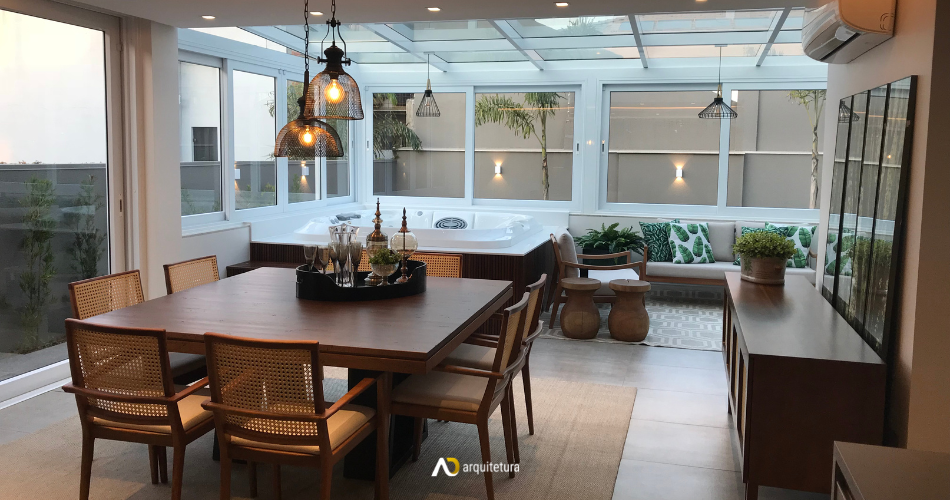 O SPA foi integrado ao ambiente interno e ganhou um fechamento e uma cobertura em vidro que ficou muito lindo e também funcional.
