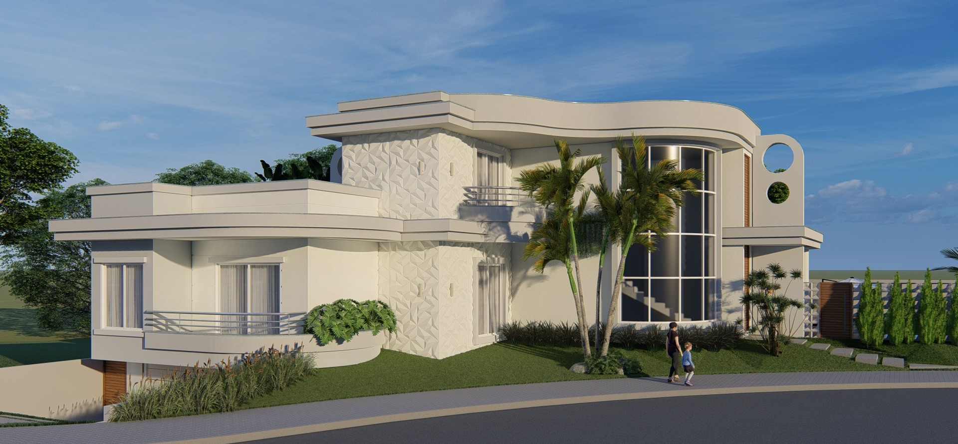 Suas formas curvas e o uso de materiais e cores claras dão leveza a essa residência que ficará imponente e muito funcional também.