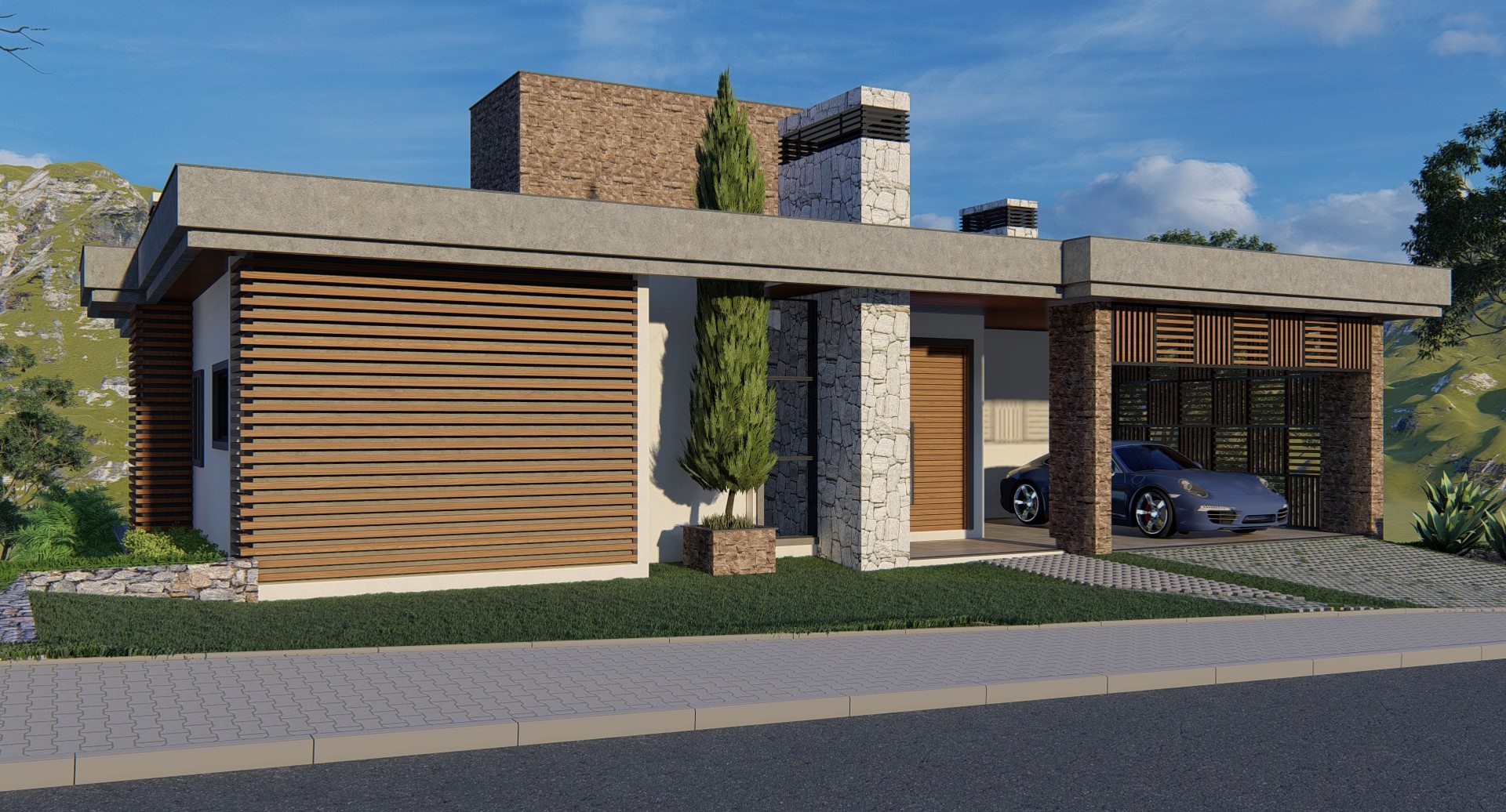 Com uma proposta de estilo contemporâneo que utiliza madeira, concreto aparente e pedras naturais para a composição de fachada e volumetria, esse projeto com 442,55 m2, tem objetivo de servir como refúgio da família para os finais de semana e receber amigos para desfrutar da estrutura que o condomínio oferece, juntamente com o lago do rio Uruguai.