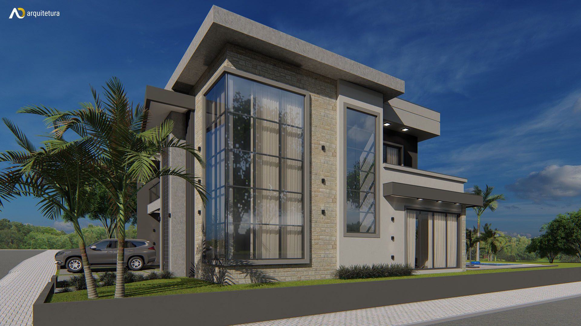 Projeto de uma residência de esquina com dois pavimentos, possuindo área de 276,25m². A casa possui acabamentos e volumetrias que conferem imponência a residência, além disso as cores escuras e elementos naturais trazem seriedade e elegância, de forma equilibrada.